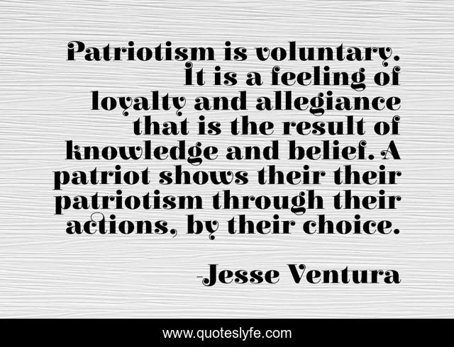 This page presents the quote "Patriotism is voluntary. It is a feeling of loyalty and allegiance that is the result of knowledge and belief. A patriot shows their their patriotism through their actions, by their choice.". Author of this quote is Jesse Ventura. This quote is about patriotism, loyalty, choice,.