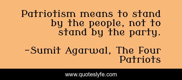 This page presents the quote "Patriotism means to stand by the people, not to stand by the party.". Author of this quote is Sumit Agarwal, The Four Patriots. This quote is about patriot, political-thriller-novels, patriotism, india, indians, political, political-thriller, contemporary, indian,.