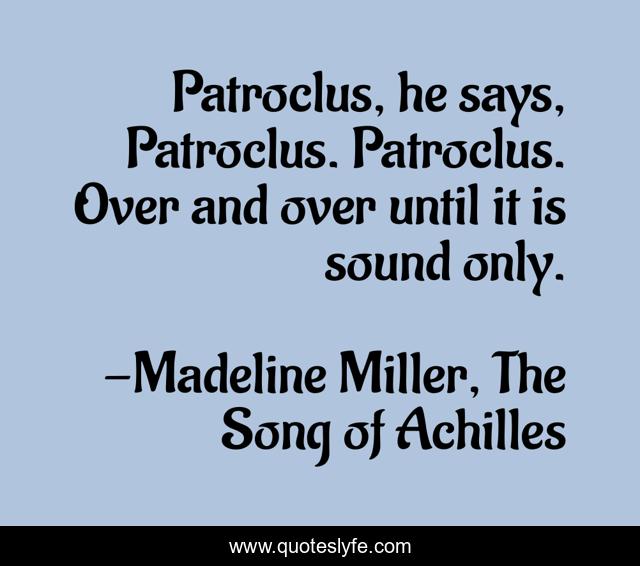This page presents the quote "Patroclus, he says, Patroclus. Patroclus. Over and over until it is sound only.". Author of this quote is Madeline Miller, The Song of Achilles. This quote is about sound, patroclus, dead, mourning, achilles, patrochilles,.