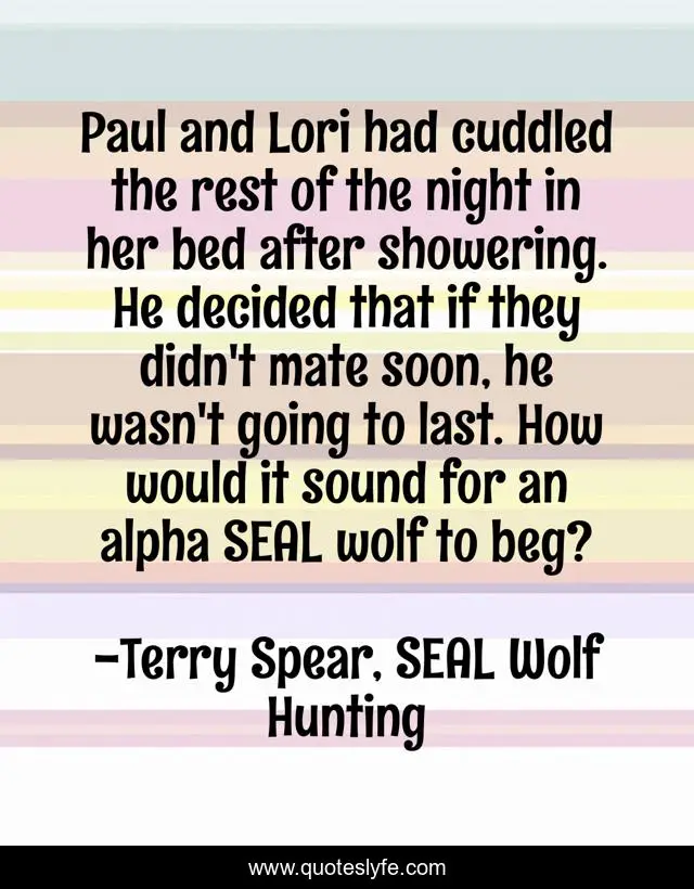 This page presents the quote "Paul and Lori had cuddled the rest of the night in her bed after showering. He decided that if they didn't mate soon, he wasn't going to last. How would it sound for an alpha SEAL wolf to beg?". Author of this quote is Terry Spear, SEAL Wolf Hunting. This quote is about military-romance, paranormal-romance, shifter-romance,.
