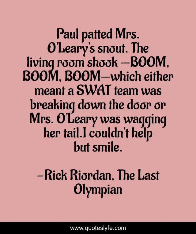 This page presents the quote "Paul patted Mrs. O'Leary's snout. The living room shook —BOOM, BOOM, BOOM—which either meant a SWAT team was breaking down the door or Mrs. O'Leary was wagging her tail.I couldn't help but smile.". Author of this quote is Rick Riordan, The Last Olympian. This quote is about mrs-o-leary, paul, percy-jackson,.