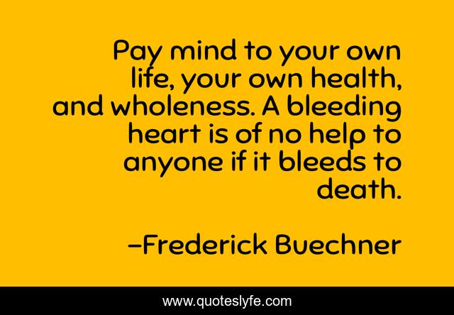 This page presents the quote "Pay mind to your own life, your own health, and wholeness. A bleeding heart is of no help to anyone if it bleeds to death.". Author of this quote is Frederick Buechner. This quote is about heart, life, death,.