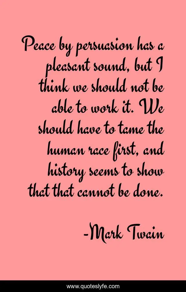 This page presents the quote "Peace by persuasion has a pleasant sound, but I think we should not be able to work it. We should have to tame the human race first, and history seems to show that that cannot be done.". Author of this quote is Mark Twain. .