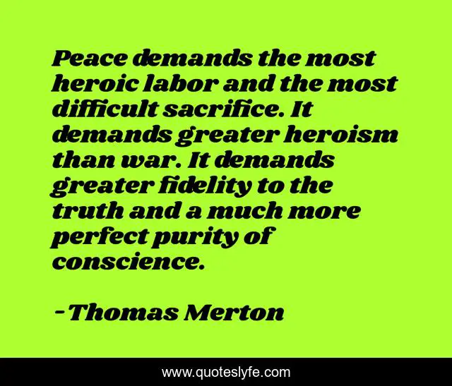 This page presents the quote "Peace demands the most heroic labor and the most difficult sacrifice. It demands greater heroism than war. It demands greater fidelity to the truth and a much more perfect purity of conscience.". Author of this quote is Thomas Merton. This quote is about enthusiasm, sacrifice, peace, inspirational,.