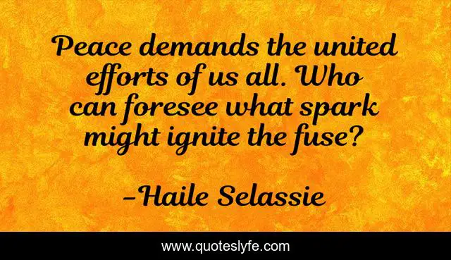 This page presents the quote "Peace demands the united efforts of us all. Who can foresee what spark might ignite the fuse?". Author of this quote is Haile Selassie. This quote is about spark, united, us,.