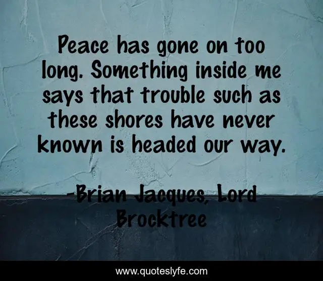 This page presents the quote "Peace has gone on too long. Something inside me says that trouble such as these shores have never known is headed our way.". Author of this quote is Brian Jacques, Lord Brocktree. .