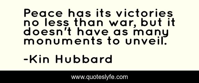 This page presents the quote "Peace has its victories no less than war, but it doesn't have as many monuments to unveil.". Author of this quote is Kin Hubbard. This quote is about victories, peace, monuments,.