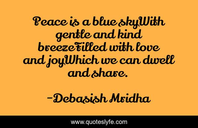 This page presents the quote "Peace is a blue skyWith gentle and kind breezeFilled with love and joyWhich we can dwell and share.". Author of this quote is Debasish Mridha. This quote is about life, love, knowledge, inspirational, intelligence, philosophy, wisdom, quotes, affection,.