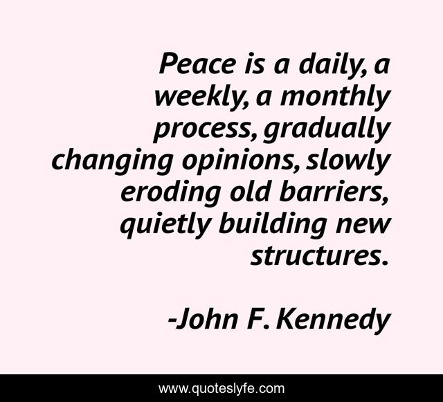 This page presents the quote "Peace is a daily, a weekly, a monthly process, gradually changing opinions, slowly eroding old barriers, quietly building new structures.". Author of this quote is John F. Kennedy. This quote is about building, opinions, daily,.