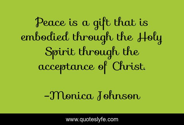 This page presents the quote "Peace is a gift that is embodied through the Holy Spirit through the acceptance of Christ.". Author of this quote is Monica Johnson. This quote is about acceptance, through, gift,.