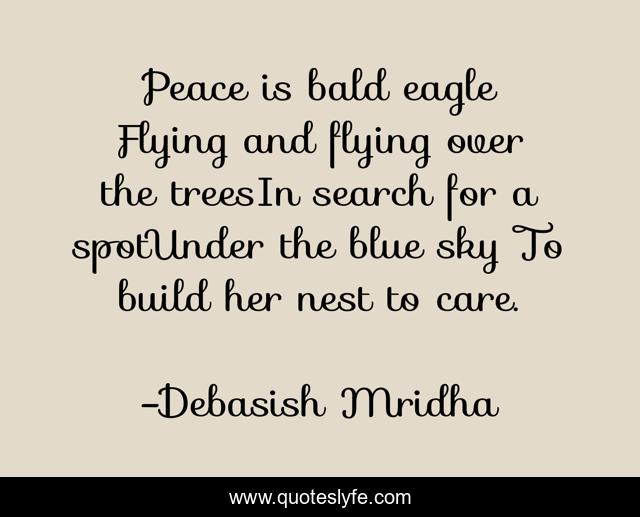 This page presents the quote "Peace is bald eagle Flying and flying over the treesIn search for a spotUnder the blue sky To build her nest to care.". Author of this quote is Debasish Mridha. This quote is about life, love, knowledge, inspirational, intelligence, philosophy, wisdom, quotes, affection,.