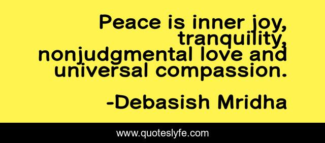 This page presents the quote "Peace is inner joy, tranquility, nonjudgmental love and universal compassion.". Author of this quote is Debasish Mridha. This quote is about life, love, knowledge, inspirational, intelligence, philosophy, wisdom, quotes, affection,.