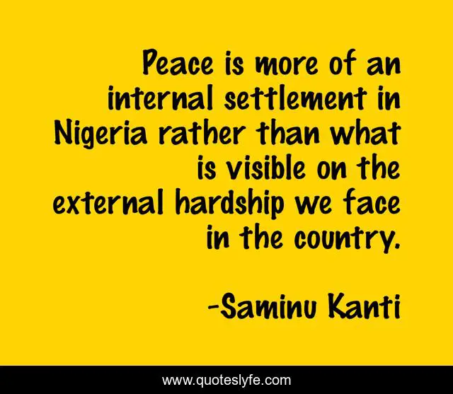 This page presents the quote "Peace is more of an internal settlement in Nigeria rather than what is visible on the external hardship we face in the country.". Author of this quote is Saminu Kanti. This quote is about nigeria, peace, hardship,.