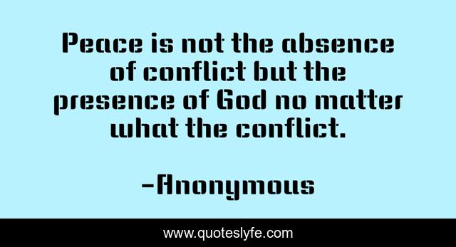 This page presents the quote "Peace is not the absence of conflict but the presence of God no matter what the conflict.". Author of this quote is Anonymous. This quote is about peace, mind,.