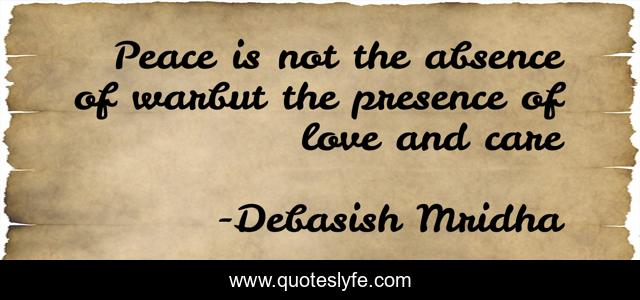 This page presents the quote "Peace is not the absence of warbut the presence of love and care". Author of this quote is Debasish Mridha. This quote is about life, love, knowledge, inspirational, intelligence, philosophy, wisdom, quotes, affection,.
