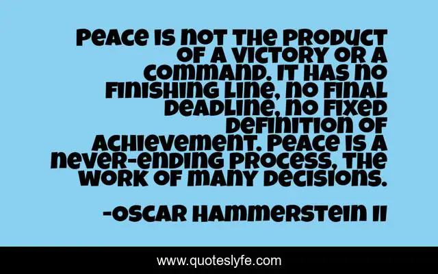 This page presents the quote "Peace is not the product of a victory or a command. It has no finishing line, no final deadline, no fixed definition of achievement. Peace is a never-ending process, the work of many decisions.". Author of this quote is Oscar Hammerstein II. This quote is about work, decisions, achievement,.