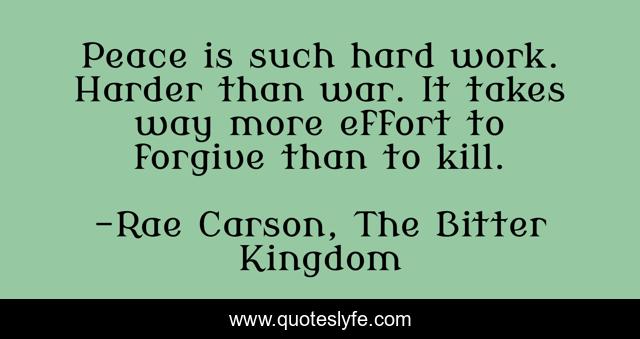 This page presents the quote "Peace is such hard work. Harder than war. It takes way more effort to forgive than to kill.". Author of this quote is Rae Carson, The Bitter Kingdom. This quote is about peace, forgiveness, war, killing,.