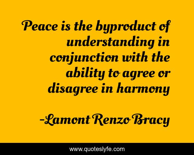 This page presents the quote "Peace is the byproduct of understanding in conjunction with the ability to agree or disagree in harmony". Author of this quote is Lamont Renzo Bracy. This quote is about peace, montgomery, harmony, fort-deposit, alabama, renzo-1-agency, serenity,.