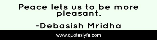 This page presents the quote "Peace lets us to be more pleasant.". Author of this quote is Debasish Mridha. This quote is about peace, philosophy, debasish-mridha, quotes, peace-lets-us-be-pleasant, inspirational, enthusiasm, debasish-mridha-m-d,.
