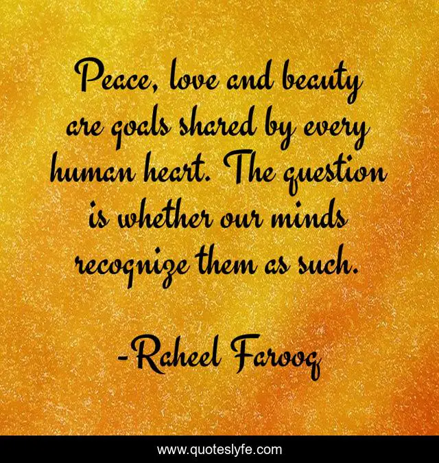 This page presents the quote "Peace, love and beauty are goals shared by every human heart. The question is whether our minds recognize them as such.". Author of this quote is Raheel Farooq. This quote is about love, beauty, peace, humans, goals, aspirations, humanity, affection, mankind,.