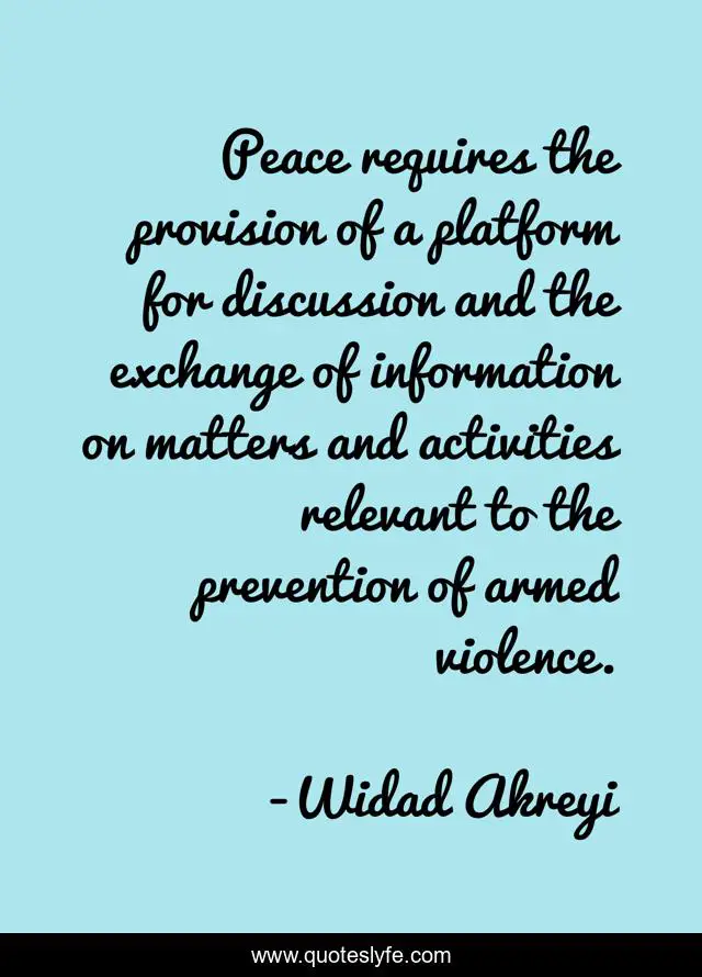 This page presents the quote "Peace requires the provision of a platform for discussion and the exchange of information on matters and activities relevant to the prevention of armed violence.". Author of this quote is Widad Akreyi. This quote is about peace, war, conflict, armed-violence,.