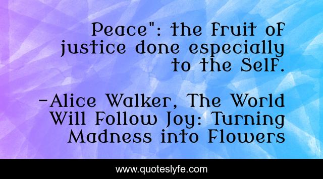 "Alice Walker, The World Will Follow Joy: Turning Madness into Flowers Quotes." Quoteslyfe.com, 2025. Sat. 06 Dec. 2025. <https://www.quoteslyfe.com/quote/Peace-the-fruit-of-justice-done-especially-141828>.