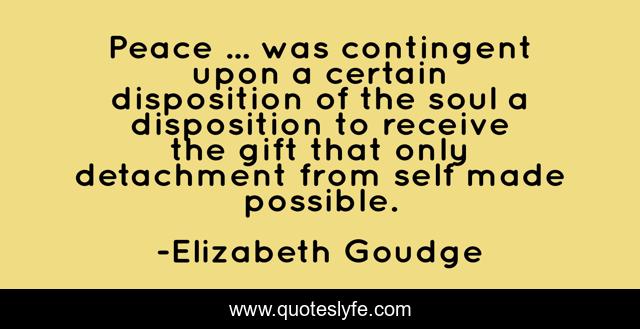 This page presents the quote "Peace ... was contingent upon a certain disposition of the soul a disposition to receive the gift that only detachment from self made possible.". Author of this quote is Elizabeth Goudge. This quote is about faith, unity,.
