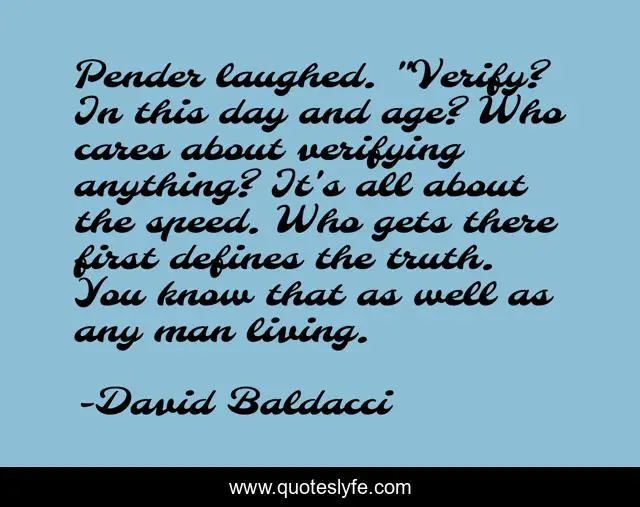 This page presents the quote "Pender laughed. "Verify? In this day and age? Who cares about verifying anything? It's all about the speed. Who gets there first defines the truth. You know that as well as any man living.". Author of this quote is David Baldacci. This quote is about journalism, verification, truth,.