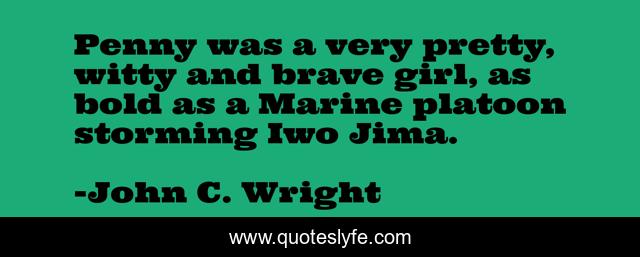 This page presents the quote "Penny was a very pretty, witty and brave girl, as bold as a Marine platoon storming Iwo Jima.". Author of this quote is John C. Wright. This quote is about comparison, girl, courage, humor, woman,.