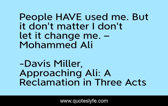 This page presents the quote "People HAVE used me. But it don't matter I don't let it change me. – Mohammed Ali". Author of this quote is Davis Miller, Approaching Ali: A Reclamation in Three Acts. This quote is about graciousness, discipleship, bitterness,.