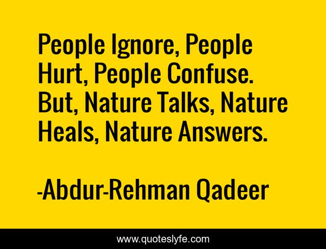 This page presents the quote "People Ignore, People Hurt, People Confuse. But, Nature Talks, Nature Heals, Nature Answers.". Author of this quote is Abdur-Rehman Qadeer. This quote is about pain, people, confusion, nature, answers, hurt, heals,.