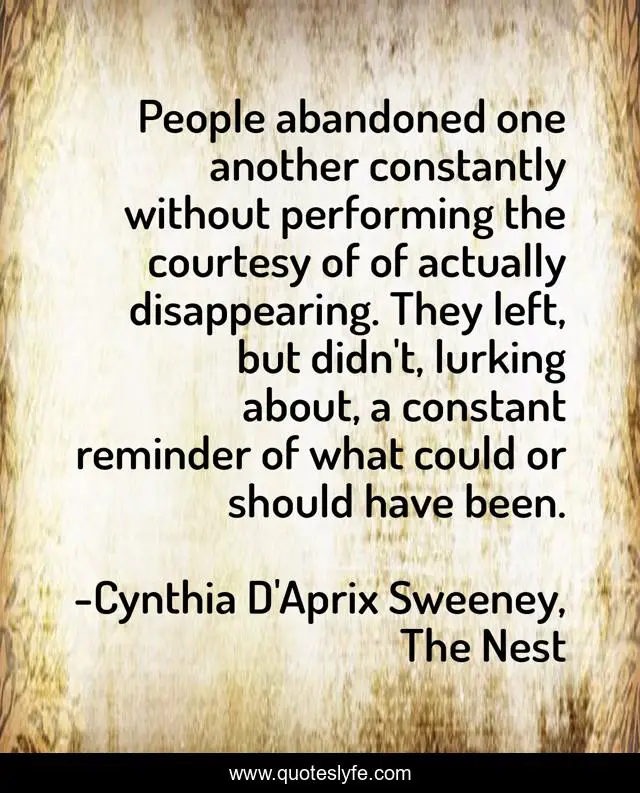 This page presents the quote "People abandoned one another constantly without performing the courtesy of of actually disappearing. They left, but didn't, lurking about, a constant reminder of what could or should have been.". Author of this quote is Cynthia D'Aprix Sweeney, The Nest. This quote is about abandonment, reminders, disappearing, disappointment,.