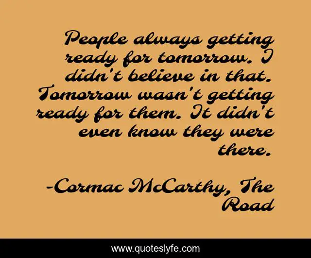 This page presents the quote "People always getting ready for tomorrow. I didn't believe in that. Tomorrow wasn't getting ready for them. It didn't even know they were there.". Author of this quote is Cormac McCarthy, The Road. This quote is about always, believe, tomorrow, getting-ready,.