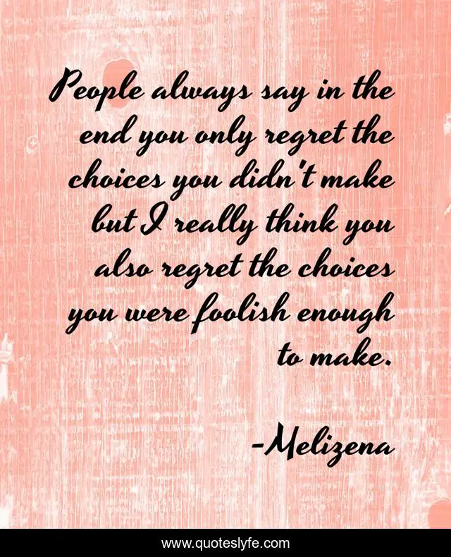 This page presents the quote "People always say in the end you only regret the choices you didn't make but I really think you also regret the choices you were foolish enough to make.". Author of this quote is Melizena. This quote is about humor, regret, choices, choices-and-consequences, decisions, regrets,.