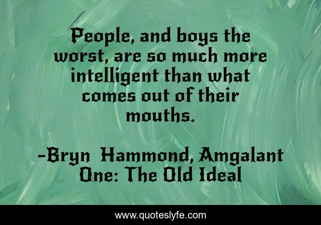 This page presents the quote "People, and boys the worst, are so much more intelligent than what comes out of their mouths.". Author of this quote is Bryn Hammond, Amgalant One: The Old Ideal. This quote is about intelligence, people,.