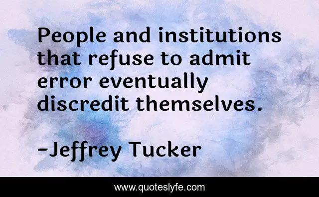This page presents the quote "People and institutions that refuse to admit error eventually discredit themselves.". Author of this quote is Jeffrey Tucker. This quote is about collectivism, laissez-faire, mistakes, democrats, libertarian, politics, trust, coercion, anarchy,.
