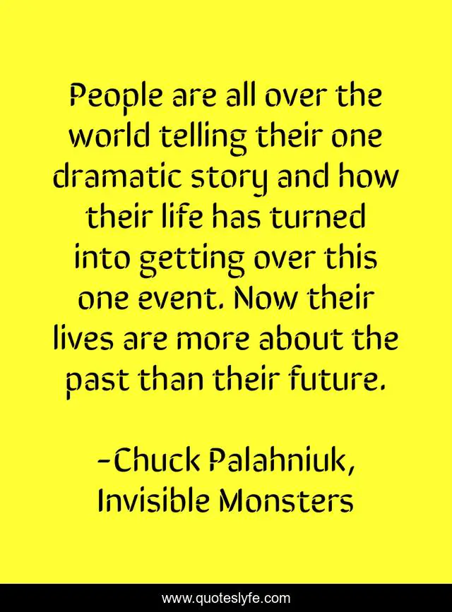 This page presents the quote "People are all over the world telling their one dramatic story and how their life has turned into getting over this one event. Now their lives are more about the past than their future.". Author of this quote is Chuck Palahniuk, Invisible Monsters. This quote is about past, human-nature, future,.