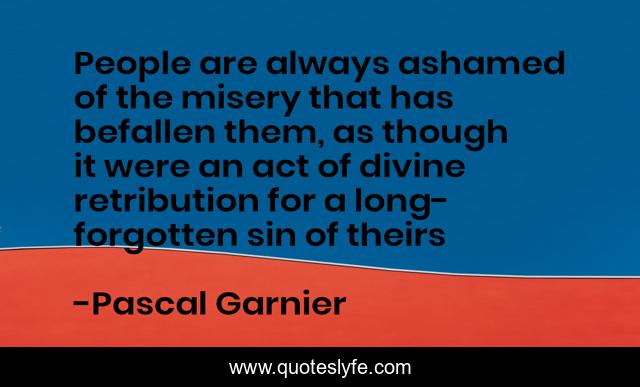 This page presents the quote "People are always ashamed of the misery that has befallen them, as though it were an act of divine retribution for a long-forgotten sin of theirs". Author of this quote is Pascal Garnier. This quote is about retribution, sin, misery,.