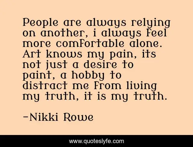 This page presents the quote "People are always relying on another, i always feel more comfortable alone. Art knows my pain, its not just a desire to paint, a hobby to distract me from living my truth, it is my truth.". Author of this quote is Nikki Rowe. This quote is about real, my-truth, art, artist, freedom, free, truth, free-spirit, pain,.
