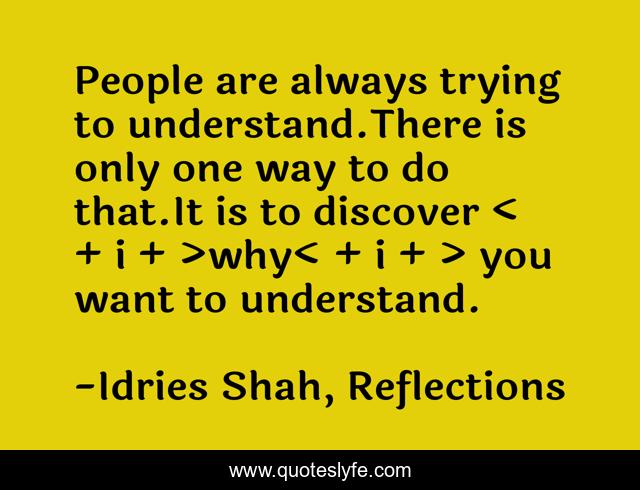 This page presents the quote "People are always trying to understand.There is only one way to do that.It is to discover < + i + >why< + i + > you want to understand.". Author of this quote is Idries Shah, Reflections. This quote is about motivations, technique, understanding,.