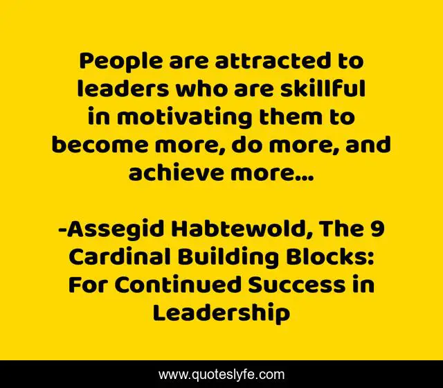This page presents the quote "People are attracted to leaders who are skillful in motivating them to become more, do more, and achieve more...". Author of this quote is Assegid Habtewold, The 9 Cardinal Building Blocks: For Continued Success in Leadership. This quote is about positive, motivation, motivational, optimistic, confidence,.