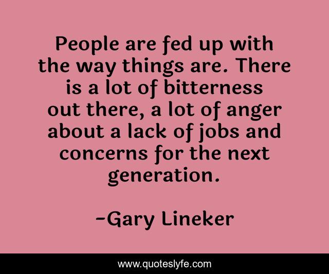 This page presents the quote "People are fed up with the way things are. There is a lot of bitterness out there, a lot of anger about a lack of jobs and concerns for the next generation.". Author of this quote is Gary Lineker. This quote is about generation, way, people,.