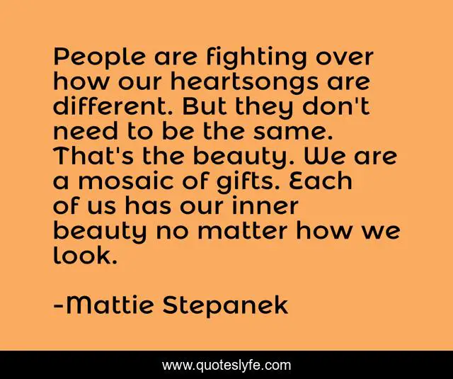 This page presents the quote "People are fighting over how our heartsongs are different. But they don't need to be the same. That's the beauty. We are a mosaic of gifts. Each of us has our inner beauty no matter how we look.". Author of this quote is Mattie Stepanek. This quote is about matter, look, people,.