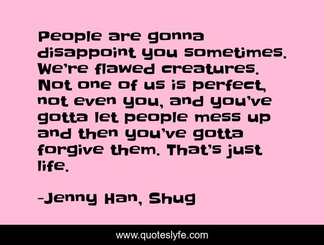 This page presents the quote "People are gonna disappoint you sometimes. We’re flawed creatures. Not one of us is perfect, not even you, and you’ve gotta let people mess up and then you’ve gotta forgive them. That’s just life.". Author of this quote is Jenny Han, Shug. .