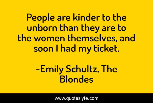 This page presents the quote "People are kinder to the unborn than they are to the women themselves, and soon I had my ticket.". Author of this quote is Emily Schultz, The Blondes. This quote is about pregnancy, feminism, women,.