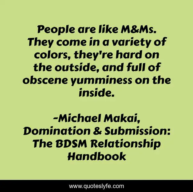 "Michael Makai, Domination & Submission: The BDSM Relationship Handbook Quotes." Quoteslyfe.com, 2025. Fri. 05 Dec. 2025. <https://www.quoteslyfe.com/quote/People-are-like-M-Ms-They-come-51274>.