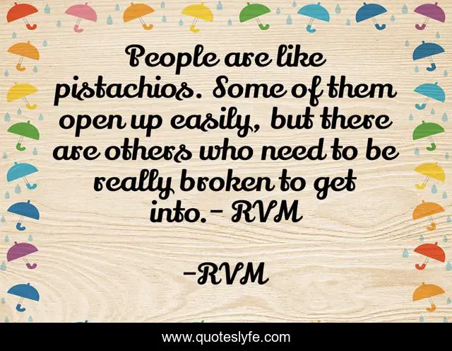 This page presents the quote "People are like pistachios. Some of them open up easily, but there are others who need to be really broken to get into.- RVM". Author of this quote is RVM. This quote is about motivation, inspiration,.