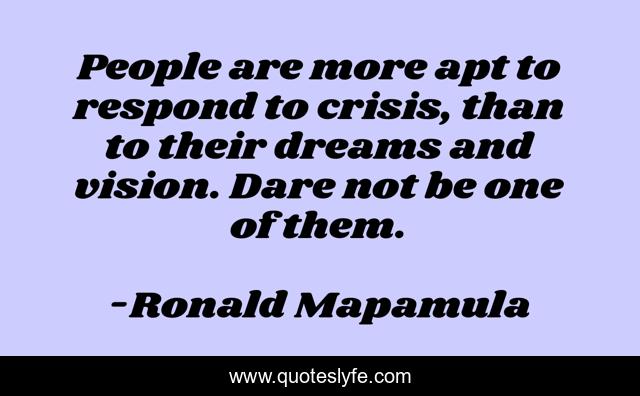 This page presents the quote "People are more apt to respond to crisis, than to their dreams and vision. Dare not be one of them.". Author of this quote is Ronald Mapamula. This quote is about success, win, winning, growth, achievement, being-different, greatness, achieve,.