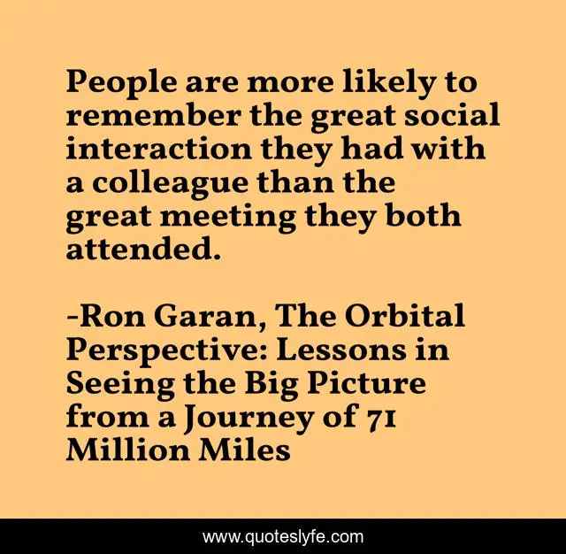 This page presents the quote "People are more likely to remember the great social interaction they had with a colleague than the great meeting they both attended.". Author of this quote is Ron Garan, The Orbital Perspective: Lessons in Seeing the Big Picture from a Journey of 71 Million Miles. This quote is about relationships, partners, colleagues, engagement, collaboration, work-together, engaging, coworkers, memory,.