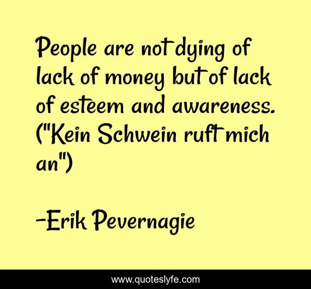 This page presents the quote "People are not dying of lack of money but of lack of esteem and awareness. ("Kein Schwein ruft mich an")". Author of this quote is Erik Pevernagie. This quote is about awareness, schwein, lack-of-money, dying, esteem,.